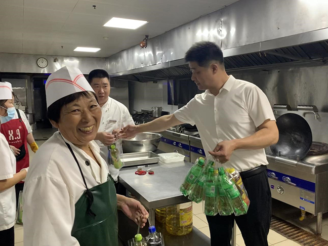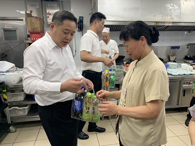 劉晉國一行為堅(jiān)守在高溫一線的職工們送上慰問品,并察看了酒店餐飲接待服務(wù)、廚房菜肴出品、工程施工作業(yè)和康體中心安全管理等方面工作情況。每到一處,劉晉國都同一線職工親切交談,詳細(xì)了解防暑降溫和日常工作情況,對(duì)他們的愛崗敬業(yè)精神表示充分肯定,反復(fù)叮囑大家要注意勞逸結(jié)合、加強(qiáng)自我防護(hù),同時(shí)要求各部門積極創(chuàng)造條件,改善工作環(huán)境,把防暑降溫工作做細(xì)做實(shí)做到位,不斷提升職工的獲得感、幸福感和歸屬感。