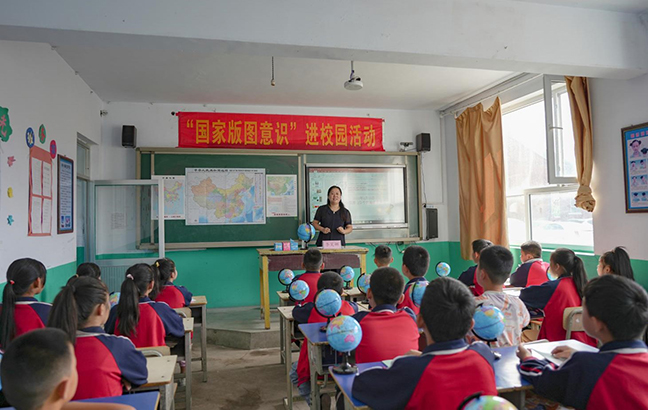 當(dāng)日上午,河北省自然資源廳、河北省測繪學(xué)會、河北中色測繪公司相關(guān)同志共同走進(jìn)承德市隆化縣柵子村小學(xué),開展“國家版圖意識”進(jìn)校園活動,為同學(xué)們送去了一堂有趣的國家版圖知識專題課?;顒蝇F(xiàn)場,石家莊鐵路職業(yè)技術(shù)學(xué)院李笑娜老師從地圖歷史、地圖規(guī)范、地理信息安全等方面,深入淺出地向同學(xué)們講解了國家版圖相關(guān)知識,以及地球儀的正確使用方法,介紹了新版標(biāo)準(zhǔn)地圖的詳細(xì)情況。中色測繪公司向該小學(xué)和村委會贈送了國家版圖知識宣傳冊、地圖冊、地球儀以及文體學(xué)習(xí)用品,鼓勵(lì)同學(xué)們積極學(xué)習(xí)版圖知識,進(jìn)一步樹立國家版圖意識,自覺維護(hù)國家版圖尊嚴(yán)。