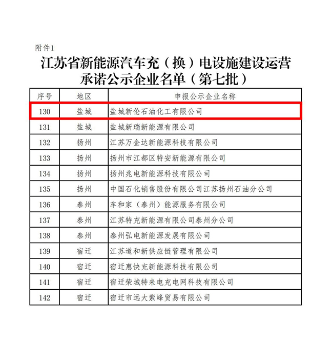 日前,省工信廳發(fā)布了《江蘇省新能源汽車充(換)電設(shè)施建設(shè)運營承諾公示企業(yè)(第七批)名單》,鹽城新倫石化公司榜上有名,正式納入我省電動汽車充電設(shè)施運營服務(wù)商目錄。