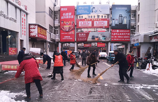 鹽城招商場(chǎng)“聞雪而動(dòng)”,組織市場(chǎng)管理人員、保潔人員、商戶(hù)志愿者到周邊道路、停車(chē)場(chǎng)、居民樓坡道開(kāi)展義務(wù)掃雪活動(dòng),并做好宣傳發(fā)動(dòng)工作,動(dòng)員市場(chǎng)商戶(hù)積極參與到活動(dòng)中來(lái)。大家干勁十足、團(tuán)結(jié)協(xié)作、有序清理,市場(chǎng)周邊積雪情況得到了極大緩解,及時(shí)保障了消費(fèi)者及來(lái)往行人的出行暢通。同時(shí),公司還組織人員赴各號(hào)樓逐層檢查,排除冰棱墜落安全隱患,進(jìn)一步保障人員出入安全。