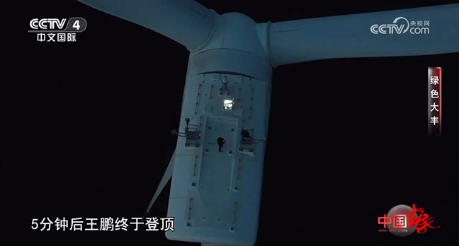 走進(jìn)風(fēng)機(jī)的內(nèi)部,馬諾感覺這里很神秘,他了解到王鵬平時不僅要對內(nèi)部進(jìn)行檢修,還要爬到風(fēng)機(jī)最頂端,對葉片、風(fēng)向儀等設(shè)備進(jìn)行出艙檢查。王鵬帶領(lǐng)攝制組登頂時,已是晚上6點(diǎn),天色漸暗。出艙檢查是對海上運(yùn)維人員身體和心理的雙重考驗,在高空平臺上作業(yè),四周沒有圍欄,王鵬唯一可以依靠的是特制防護(hù)服上的掛鉤。海上運(yùn)維人員在風(fēng)機(jī)里工作的時間并不固定,有時甚至長達(dá)8小時到10小時。為了補(bǔ)充體力,工作人員有時會把飯菜帶到風(fēng)機(jī)上吃。